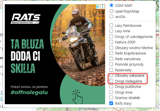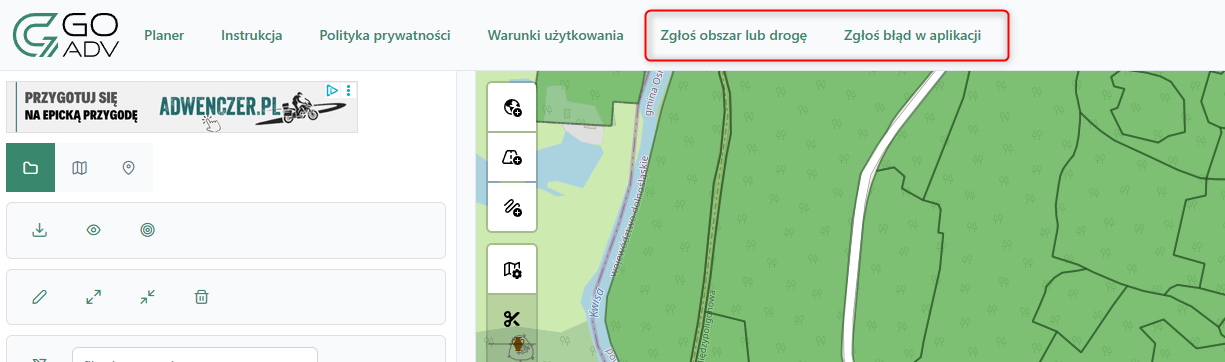 - 2 nowe warstwy – zakazane obszary i drogi. Tu będą pojawiać się drogi i tereny, na które nie możemy wjechać. Zgłoszeń można dokonywać przez formularz: https://goadv.app/zgloszenie/